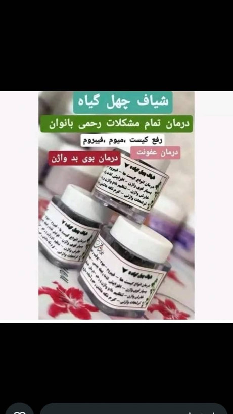 خانمها چهل گیاه کلی کاربرد دارد 👌🏻به غیره درمان عفونت و پاکسازی کامل رحم و واژن ،این گیاه میتونه کیست،افتادگی رحم ،فیبرم و گشادی واژن را نیز درمان کند،،،درمان تمامی مشکلات رحمی فقط با چهل گیاه🤞عفونت زنانه وگشادی واژن بیشترین مشکل بانوان ،،،،،⛔علت عفونت واژینال چی میتونه باشه🤔انتقال از راه رابطه جنسی،،،😳رعایت نکردن بهداشت ،،،رطوبت در لباس زیر ،،،چاقی مفرط😊🎈🎈علایم عفونت خارش،سوزش،درد،ترشحات زیاد ،🙊بوی بد ترشح و واژن🙊تکرارادرار،،،گاها اگه عفونت شدیدباشه تب و حالت تهوع😳🎈🎈عوارض عفونت🤔ناباروری،،تاخیر در پریودی 😔درد شدید😳ضخامت رحم ،دردهای شدید دوران بارداری ،،،چسبندگی رحم و لوله های رحم🙊⛔⛔⛔⛔راه درمان عفونت فقط شیاف چهل گیاه 🌸چهل گیاه دارویی است که باید واژینال بشه و تمام عفونتها حتی از سالیان پیش که چسبیده ب رحمهست را برطرف میکنه 🧐😱🤗.